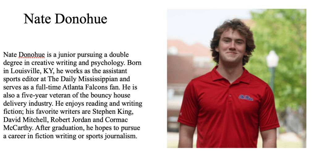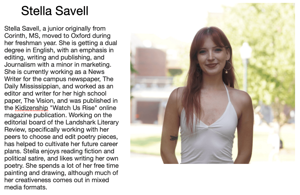 Landshark Literary Reviewis an undergraduate literary magazine at the University of Mississippi striving to represent students’ and young Mississippi writers’ voices and creativity through a diverse selection of content that showcases individuality, originality, and inclusivity. Over the past few months, it has become even more important for students to have a safe space to share their thoughts, emotions, and experiences as they struggle to feel heard and be reassured that they are not alone. Landshark Literary Review believes that literary magazines are important for fostering a community, and one of our goals as an undergraduate literary magazine is to create a smaller community of minds among the larger community of University of Mississippi. This magazine serves as an outlet for students (writers, editors, artists, and readers) to express themselves, release stress, and showcase their inner creativity through stories, poetry and artwork.